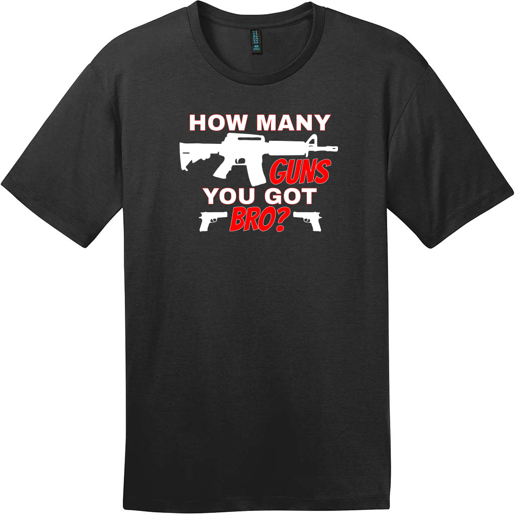 This How Many Guns You Got Bro T-Shirt for Adults is printed to a high quality ringspun cotton t shirt for a very soft feel with tight stitching. Designs printed to these premium cotton t shirts come out bright and vivid with great attention to detail. All T Shirts are printed and shipped from U.S. Custom Tees.